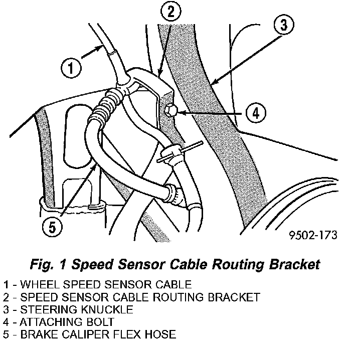 5. If equipped with antilock brakes, remove bolt securing wheel speed sensor cable routing bracket to steering knuckle.