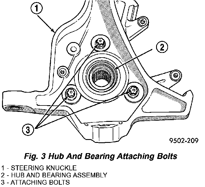 9. Remove 3 bolts attaching the hub and bearing assembly to steering knuckle.