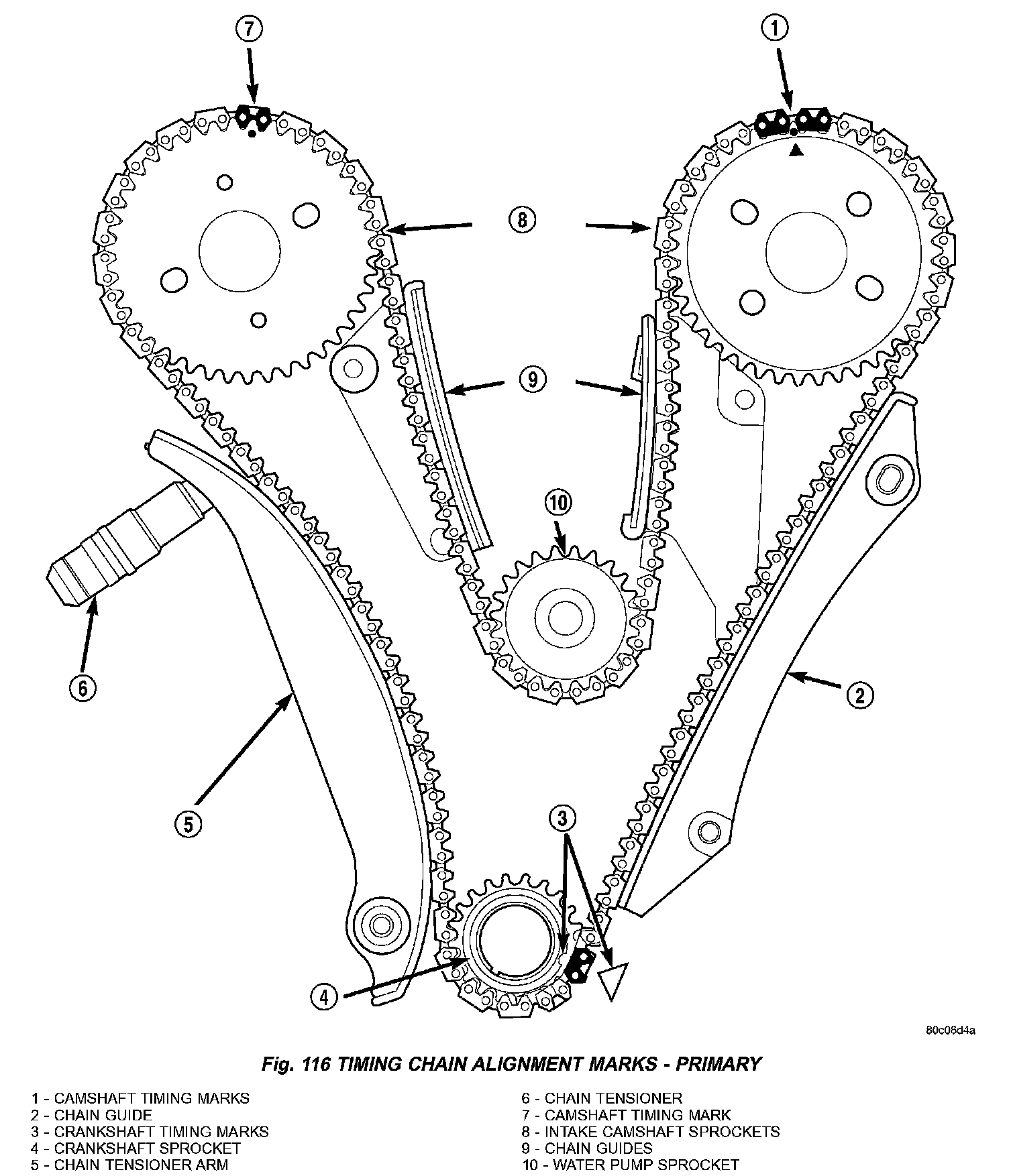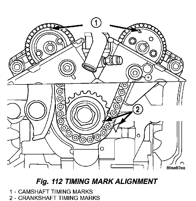 11. Verify that all chain timing (plated) links are properly aligned to the timing marks on all sprockets (Fig. 116).