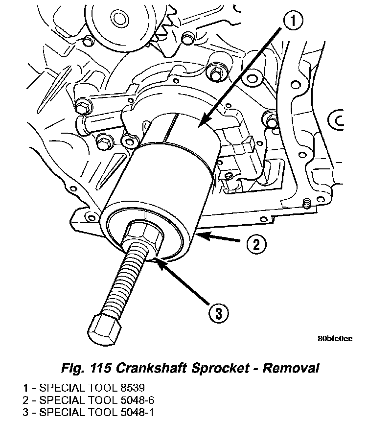 2. Remove crankshaft sprocket by first installing the crankshaft damper bolt. Apply grease or equivalent to damper bolt head and position Special Tools 5048-1, 5048-6, and 8539 on sprocket and crankshaft nose (Fig. 115). Remove sprocket using care not to rotate the crankshaft.