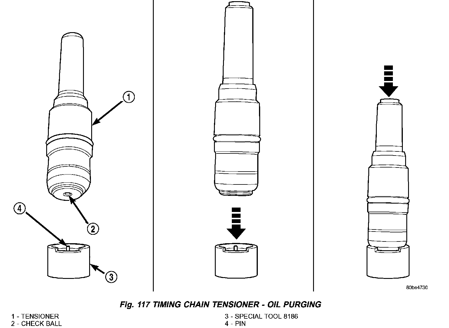 b. Using hand pressure, slowly depress tensioner until oil is purged from tensioner (Fig. 117).