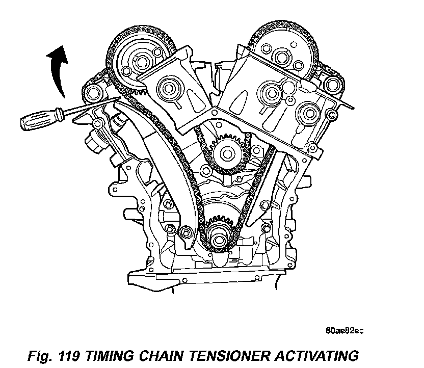 21. Activate the timing chain tensioner by using a flat bladed pry tool to gently pry tensioner arm towards the tensioner slightly (Fig. 119). Then release the tensioner arm. Verify the tensioner is activated (extends).