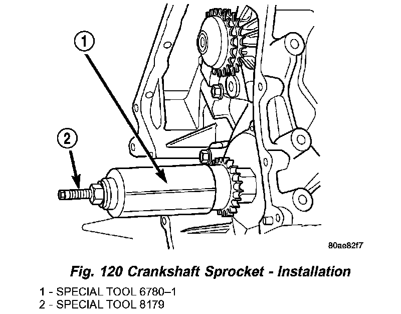 1. Install crankshaft sprocket using Special Tools 6780-1 and 8179 (Fig. 120) until sprocket bottoms against crankshaft step flange. Use care not to rotate crankshaft.