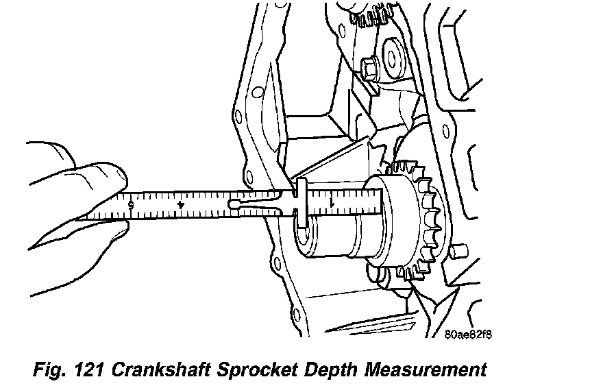 2. Verify that crankshaft sprocket is installed to proper depth by measuring from sprocket outer face to end of crankshaft (Fig. 121). Measurement should read: 39.05 ± 0.50 mm (1.5374 ± 0.020 in.).