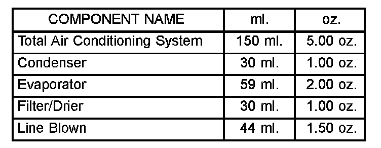 When an air conditioning system is first assembled, all components (except the compressor) are refrigerant oil free. After the system has been charged with (R-134a) refrigerant and operated, the oil in the compressor is dispersed through the lines and components. The evaporator, condenser and receiver/drier will retain a significant amount of oil. Refer to the A/C Component Refrigerant Oil Capacities table. When a component is replaced, the specified amount of refrigerant oil must be added. When the compressor is replaced, the amount of oil that is retained in the rest of the system must be drained from the replacement compressor. When a line or component has ruptured and oil has escaped, the compressor should be removed and drained. The receiver/drier must be replaced along with the ruptured part. The oil capacity of the system, minus the amount of oil still in the remaining components, can be measured and poured into the suction port of the compressor.