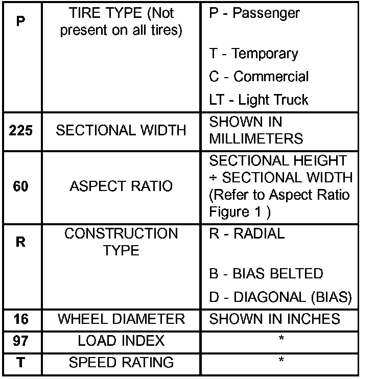 Tire type, size, load index and speed rating are encoded in the letters and numbers imprinted on the side wall of the tire. Refer to the Tire Identification chart to decipher the code. For example purposes, the tire size P225/60 R 16 97 T is used in the chart. An All Season type tire will also have either M + S, M & S or M - S (indicating mud and snow traction) imprinted on the side wall. An Extra or Light Load marking "XL" or "LL" may also be listed on the sidewall. The absence of an "XL" or "LL" marking infers a standard load tire.
