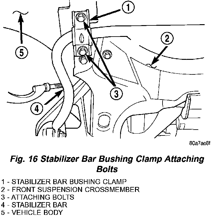 11. Remove the stabilizer bar bushing clamp-to-body attaching bolts. The stabilizer bar bushing clamp-to-crossmember bolts do not need to be removed.