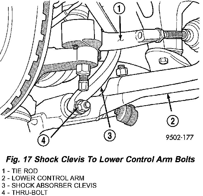 13. Loosely install the 2 shock absorber clevis-to-lower control arm thru-bolts and nuts. Do not tighten bolts at this time.