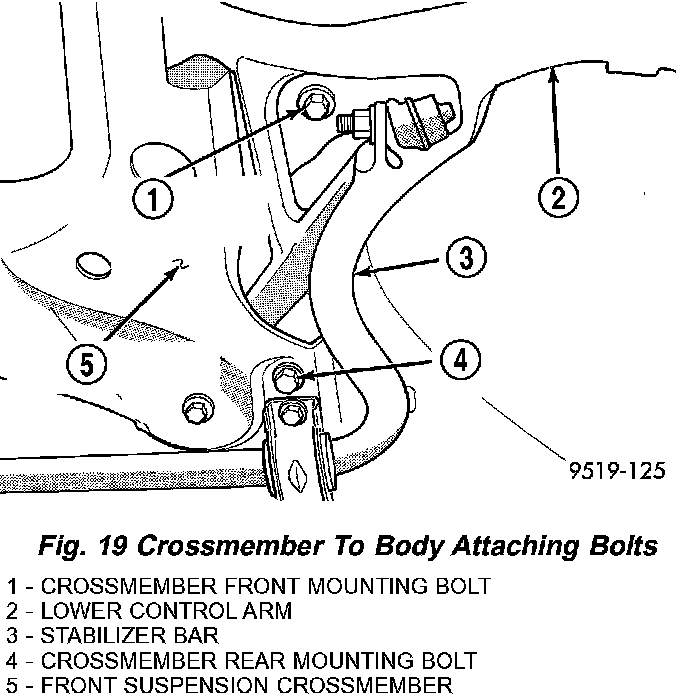 19. On each side of the vehicle, remove the 2 bolts attaching the front and rear of the front suspension crossmember to the frame rails of vehicle.
