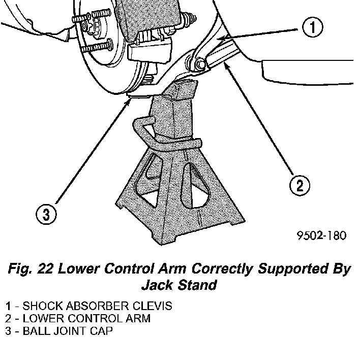 18. Lower vehicle and support front end of vehicle by positioning jack stands as shown at each lower control arm as the vehicle is lowered. Continue to lower vehicle until the total front end weight is supported by the jack stands.