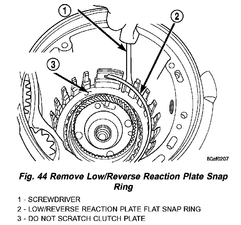34. Remove low/reverse reaction plate snap ring (Fig. 44).