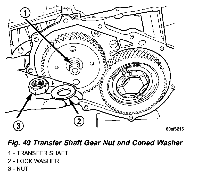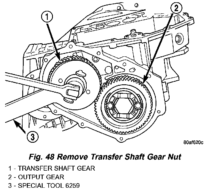 38. Using Tool 6259, remove transfer shaft gear-to-shaft nut and coned washer (Fig. 48) (Fig. 49).