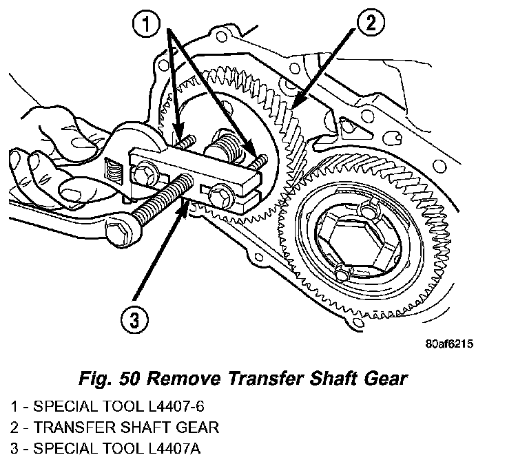 39. Using tool L-4407A, remove transfer shaft gear (Fig. 50).