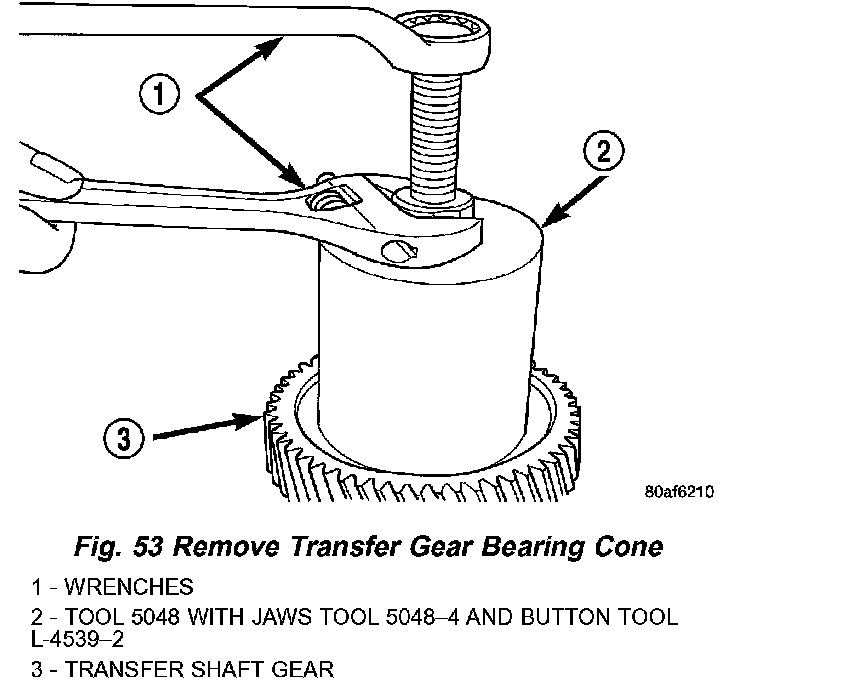42. Remove transfer gear bearing cone using setup shown in (Fig. 53).