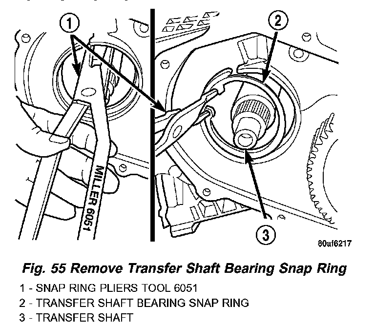 44. Using Tool 6051, remove transfer shaft bearing snap ring (Fig. 55).