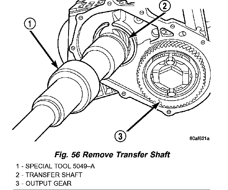 45. Using tool 5049A, remove transfer shaft from transaxle (Fig. 56).