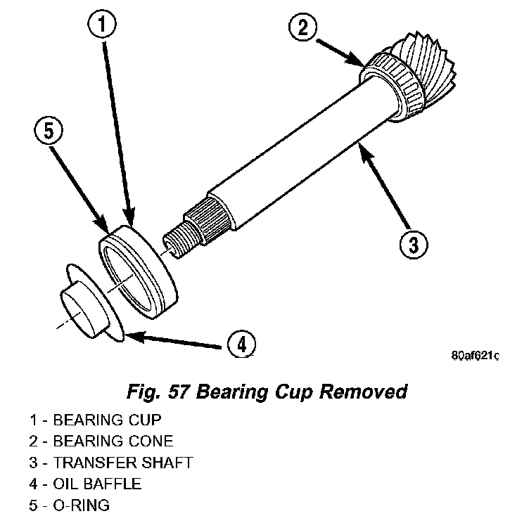 46. Slip bearing cup retainer and oil baffle off of shaft (Fig. 57).