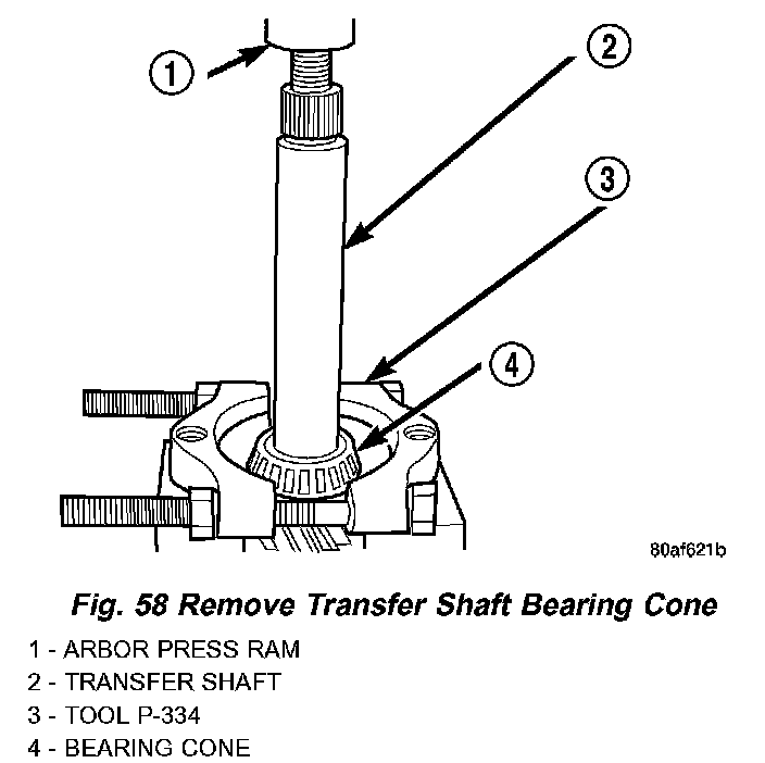 47. Using tool P-334, press transfer shaft bearing cone off of shaft (Fig. 58).