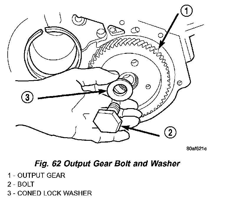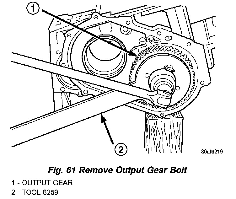 51. Using Tool 6259 (Fig. 61), remove output shaft gear-to-shaft bolt and washer (Fig. 62).