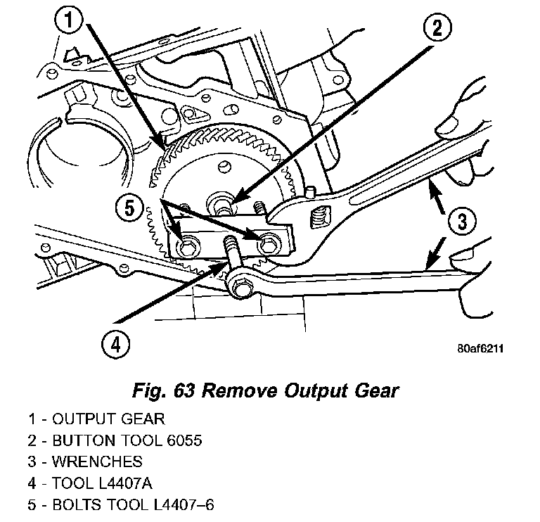 52. Using Tool L4407A, and button 6055, remove output gear from shaft (Fig. 63).