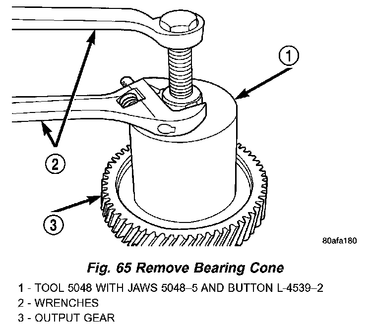 54. Using setup as shown in (Fig. 65), remove output gear bearing cone.