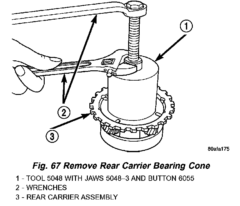56. Remove rear carrier assembly bearing cone using setup shown in (Fig. 67).