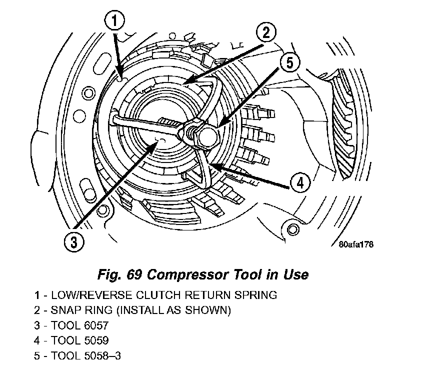 57. Install low/reverse spring compressor tool as shown in (Fig. 68) (Fig. 69).