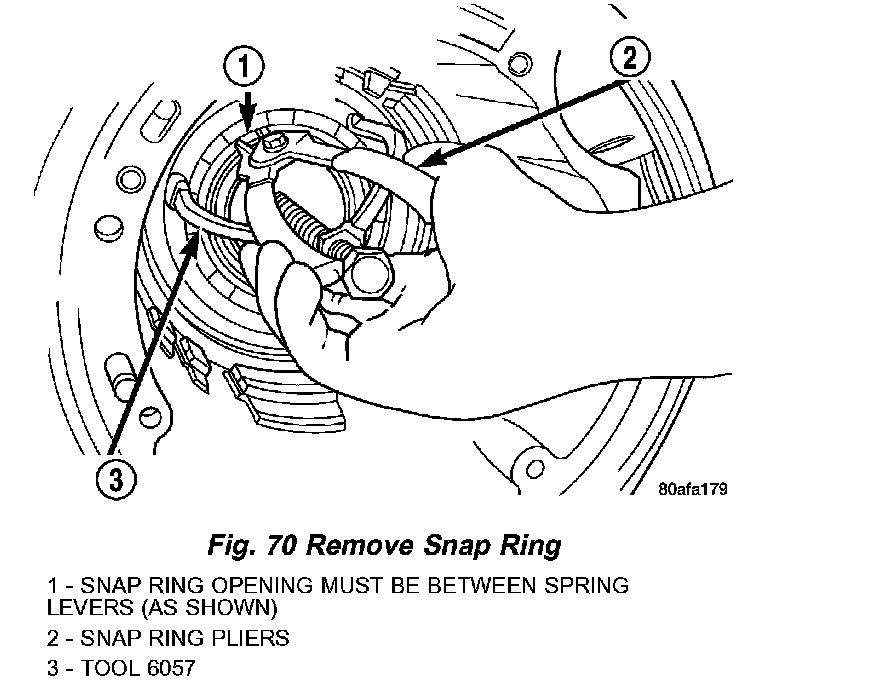 58. Compress low/reverse piston return spring and remove snap ring (Fig. 70).