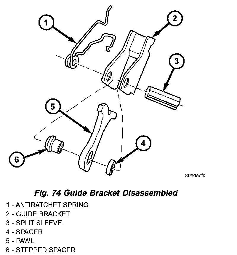 62. Inspect guide bracket components for excessive wear and replace if necessary (Fig. 74).
