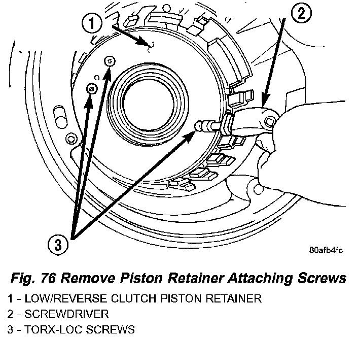 64. Remove low/reverse piston retainer-to-case screws (Fig. 76).