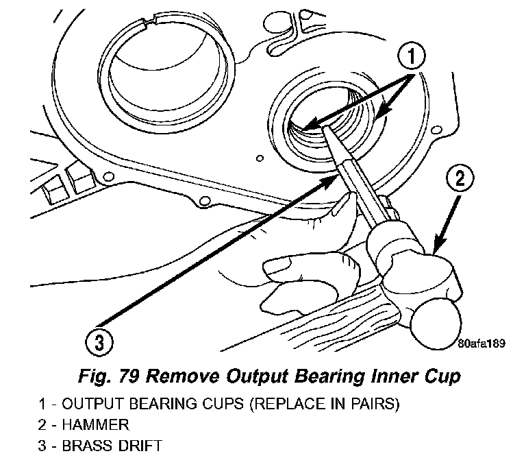 67. Using a hammer and suitable drift, drive out inner output bearing cup (Fig. 79).