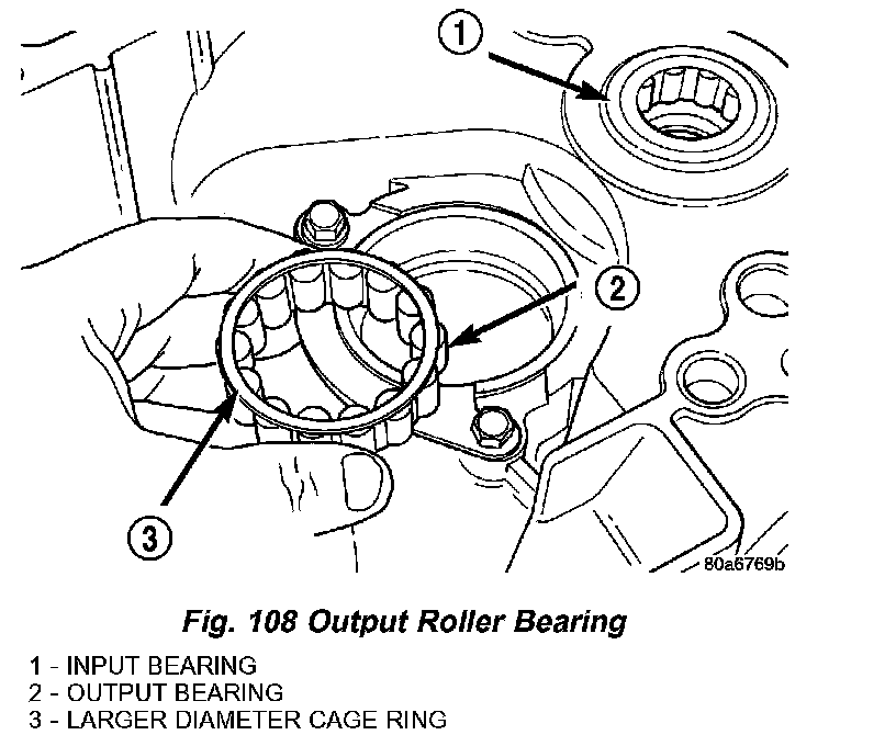1. Remove caged roller bearing from output bearing race (Fig. 108).
