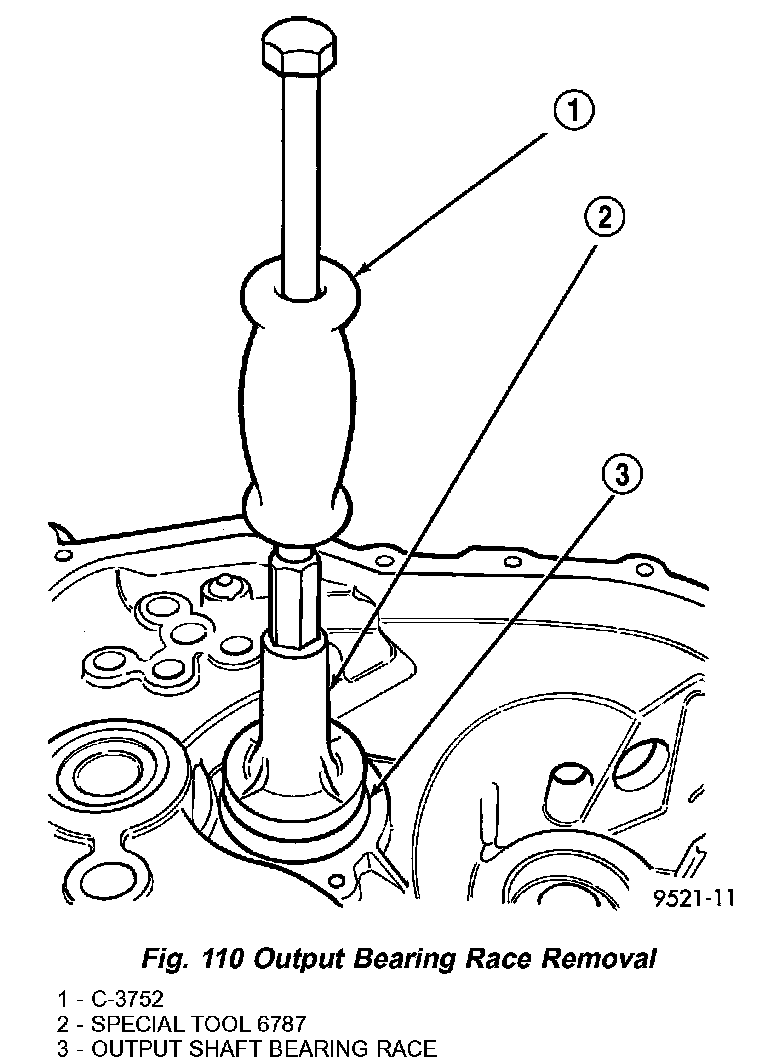 3. Install tool # 6787 and slide hammer (Fig. 110). Tighten tool to output bearing race.