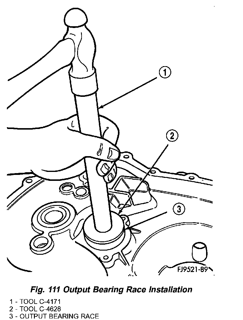 2. Insert tool # 4628 with C-4171 into output bearing race (Fig. 111). Tap race into bore. Install output bearing into race. Verify that the larger diameter cage is facing outward. Position bearing retaining strap. Tighten bolts to 11 Nm (96 in. lbs.).