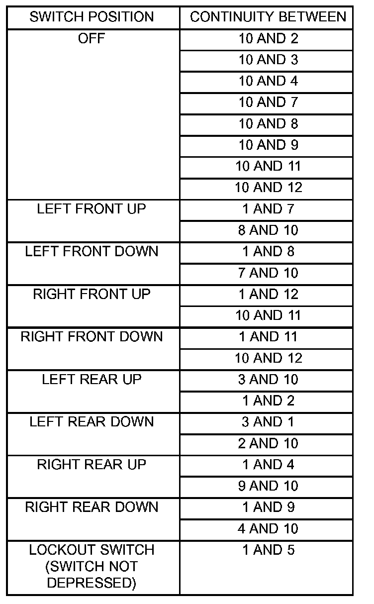 For switch testing, remove the switch. (Refer to ELECTRICAL/POWER WINDOWS/POWER WINDOW SWITCH - REMOVAL ). Using an ohmmeter, refer to Window Switch Continuity Charts to determine if continuity is correct and. If the results are not obtained, replace the switch.