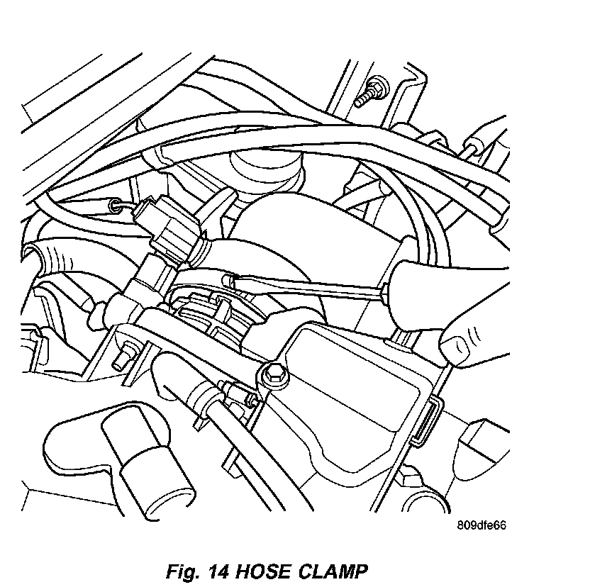 3. Disconnect fresh air makeup hose from throttle body air inlet hose (Fig. 13). Loosen clamp at throttle body (Fig. 14).