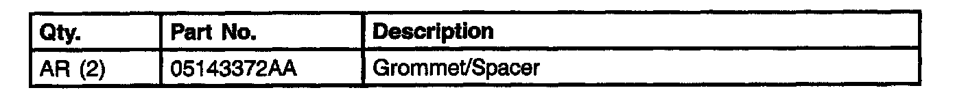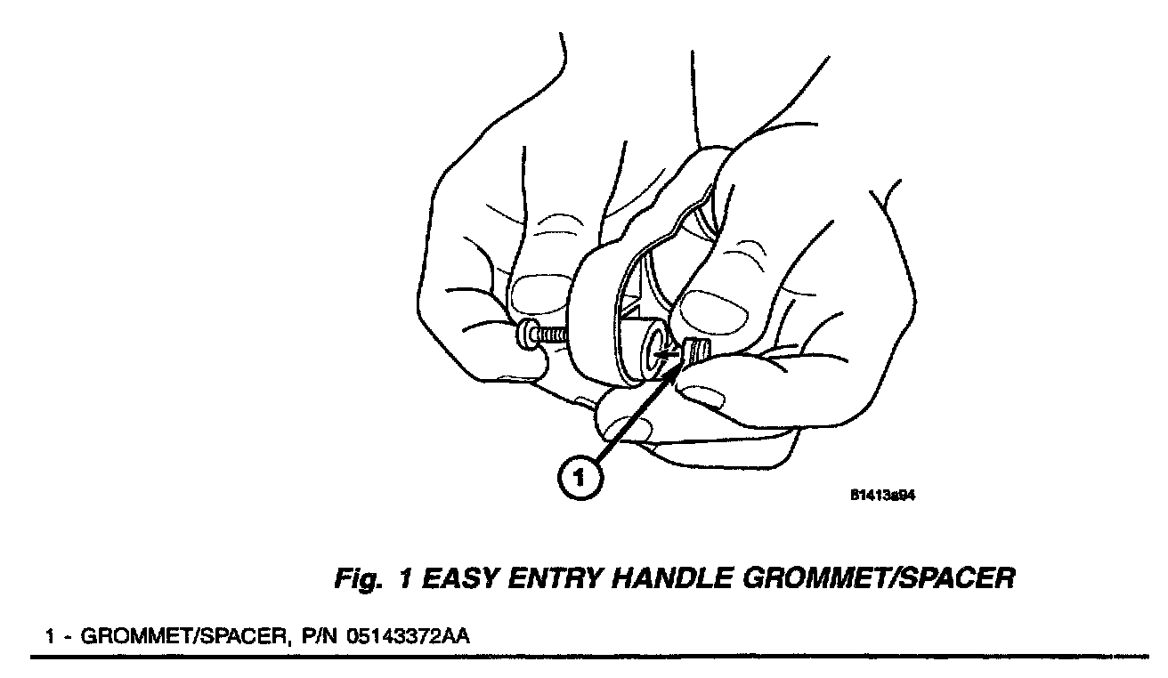 2. Install grommet/spacer, p/n 05143372AA, in the "Easy Entry" handle so the attaching screw passes through the hole in the grommet/spacer, (Fig. 1).