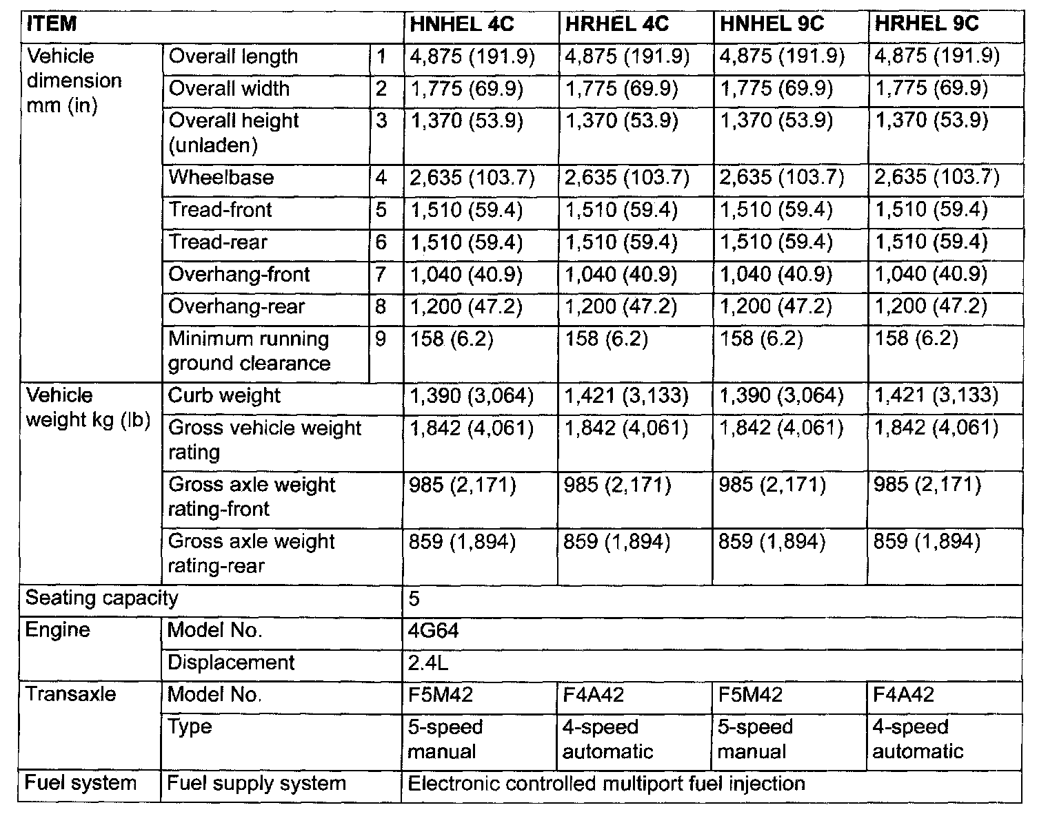 General Specifications(Model With 2.4L Engine):