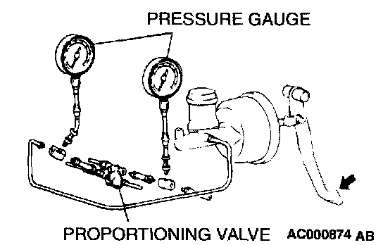 PROPORTIONING VALVE FUNCTION TEST1. Connect two pressure gauges, one each to the input side and output side of the proportioning valve, as shown.