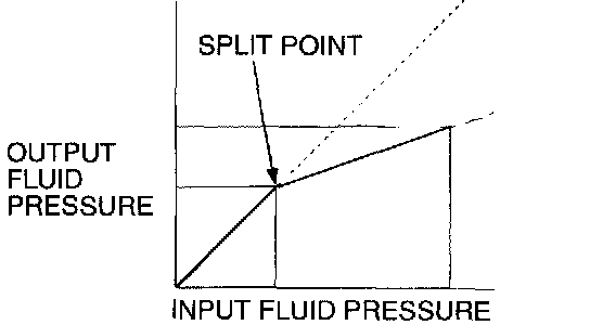 1) Output fluid pressure begins to drop relative to input fluid pressure (split point).