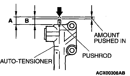 1. Apply 98 - 196 N (22 - 44 lbs.) force to the pushrod of the auto-tensioner by pressing it against a metal object (such as the engine block) and measure the movement of the pushrod.