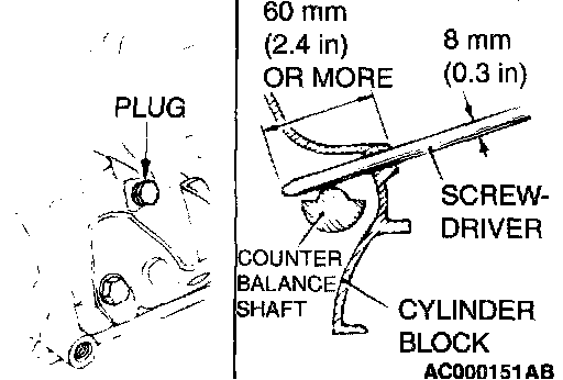 2. After aligning the timing mark on the oil pump sprocket, remove the cylinder block plug and insert a Phillips) head 8 mm (0.3 in.) screwdriver. Check to be sure that the screwdriver goes in 60 mm (2.4 inches) or more. If the screwdriver will only go in 20 - 25 mm (0.8 - 1.0 in.) before striking the counterbalance shaft, turn the sprocket once, realign the timing marks and check that the screwdriver goes in 60 mm (2.4 inches) or more. The screwdriver should not be taken out until the timing belt is installed.