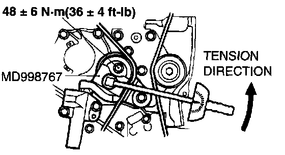 2. Loosen the tension pulley fixing bolt, and then use special tool MD998767 and a torque wrench to tighten the fixing bolt to the specified torque while applying tension to the timing belt.
