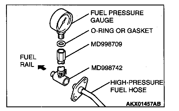 2. Place a suitable O-ring or gasket on assembled special tools MD998709 and MD998742 and install the fuel pressure gauge.