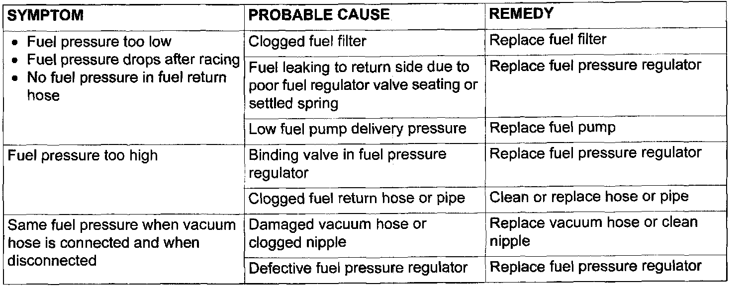 12. If any of fuel pressure measured in steps 10 to 13 is out of specification, troubleshoot and repair according to the table below.