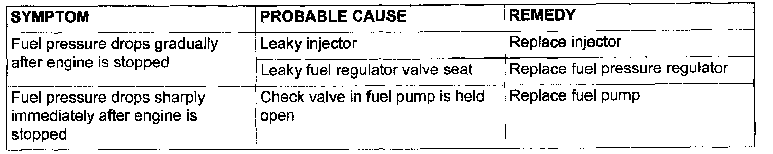 13. Stop the engine and observe fuel pressure gauge reading. It is normal if the reading does not drop within two minutes. If it does, observe the rate of drop and troubleshoot and repair according to the table below. Start, then stop the engine.