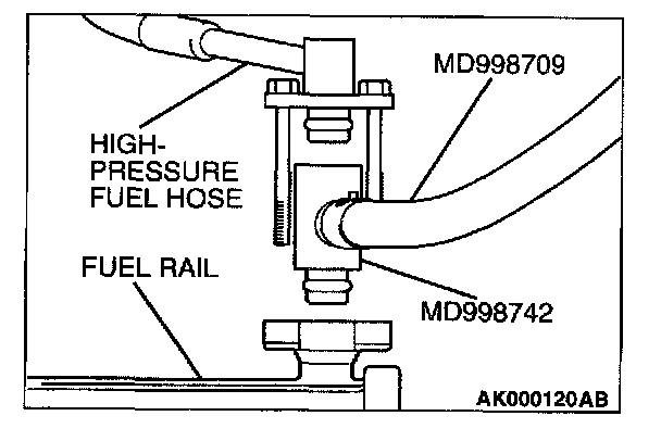 15. Remove the fuel pressure gauge, and special tools MD998709 and MD998742 from the fuel rail.