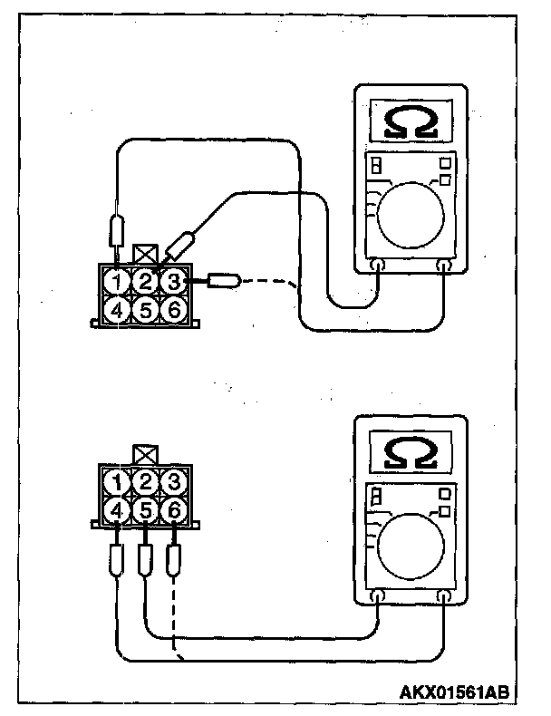 2. Measure resistance between terminal No. 2 and either terminal No. 1 or terminal No. 3 of the connector at the idle air control motor side.