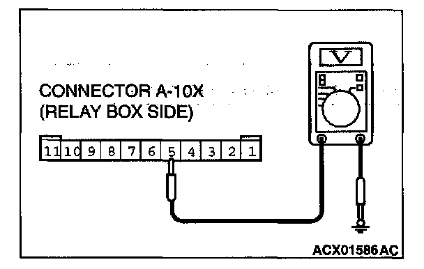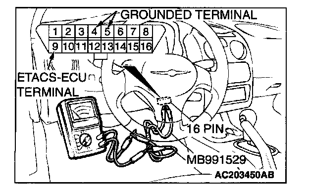 1. Use special tool MB991529 to connect a voltmeter between ground terminal 4 or 5 and ETACS-ECU terminal 9 of the data link connector.