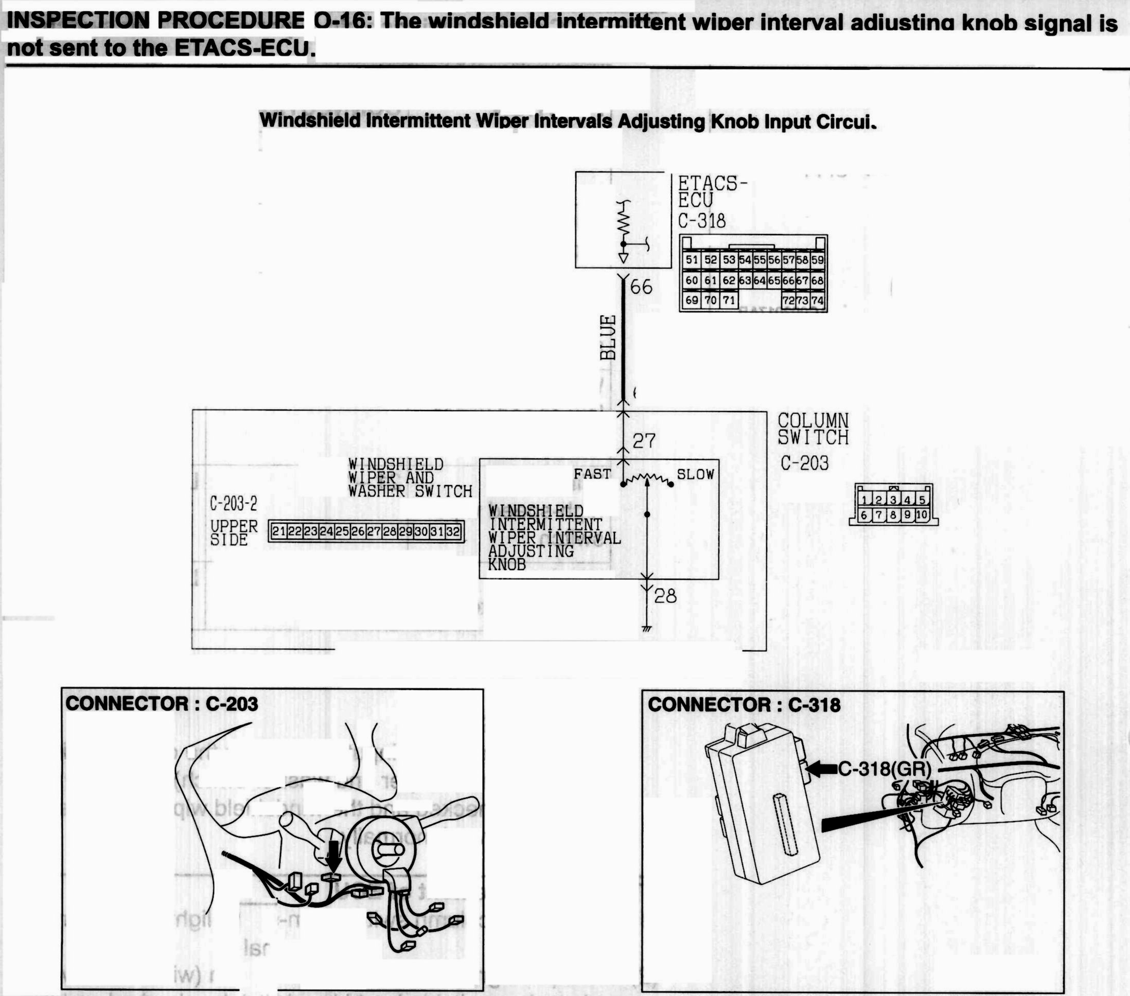 INSPECTION PROCEDURE O-16: The windshield intermittent wiper interval adjusting knob signal is not sent to the ETACS-ECU.